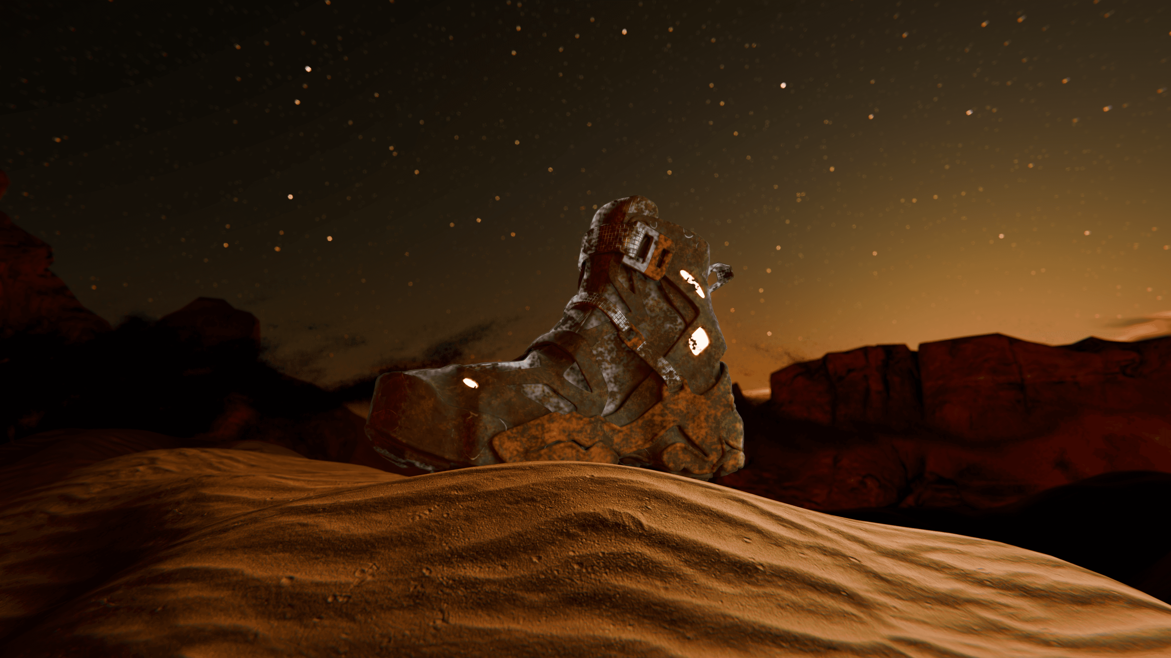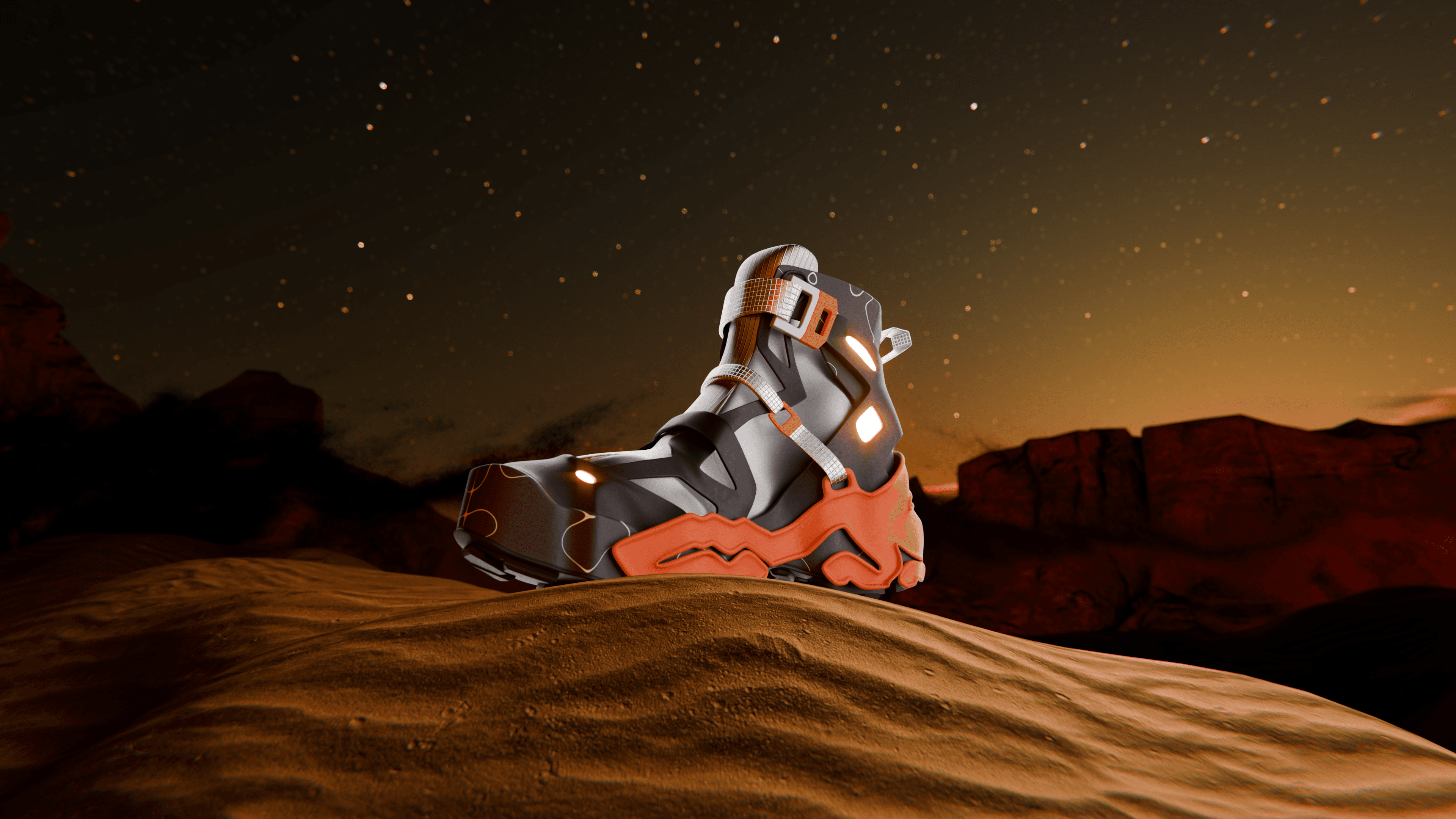 The "Terra-Trek Boot" project is a 3D concept study and photorealistic visualization of a futuristic, all-terrain exploration boot.